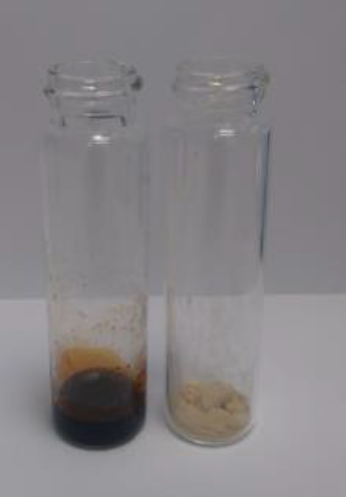 ▲ 圖3. 在噴霧干燥前將提取物干燥成糊狀(左),并使用麥芽糊精和噴霧干燥過程將其干燥成固體配方(右)。