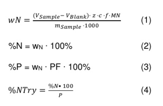結(jié)果以氮的百分比計(jì)算得出。為了計(jì)算樣品中的蛋白質(zhì)含量,需將氮含量乘以特定樣品的蛋白質(zhì)系數(shù)。以下公式(1)、(2)和(3)用于計(jì)算結(jié)果。