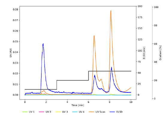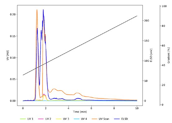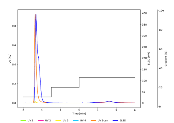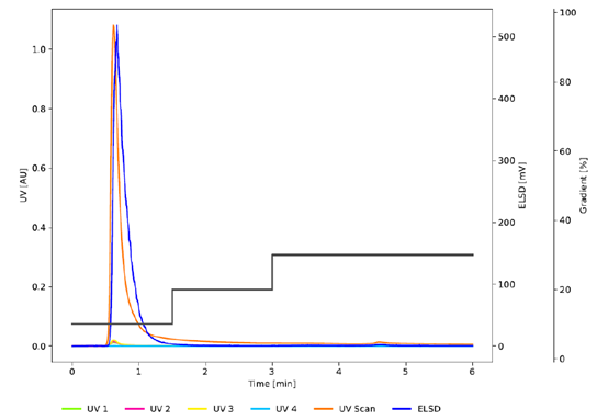 圖3 為與 圖2 相同條件下的色譜圖,使用C18非WP (100 ?) (PrepPure C18, 10 μm)研究孔徑的影響。雖然紫外信號表明與C18WP相比,前兩個(gè)峰的分辨率提高了,但較低的吸光度和ELSD信號表明沒有發(fā)生有效的分離。C18WP的大孔徑(300 ?)使蛋白質(zhì)能夠穿透顆粒并有效地與固定相相互作用。相比之下,PrepPure C18 (100 ?), 10 μm無法實(shí)現(xiàn)分離,因?yàn)榈鞍踪|(zhì)只能與顆粒的外表面相互作用。這種有限的相互作用減少了吸附和解吸之間的平衡步驟的數(shù)量,從而影響了分離效率。