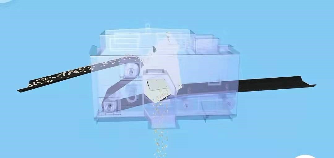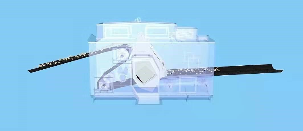 當三通漏斗出口與兩側卸料口錯開時,翻轉到另一個極限位置時,物料拋下來之后,落在輸送帶上繼續向前輸送,此時為不進行中間卸料狀態。如圖6、7所示: