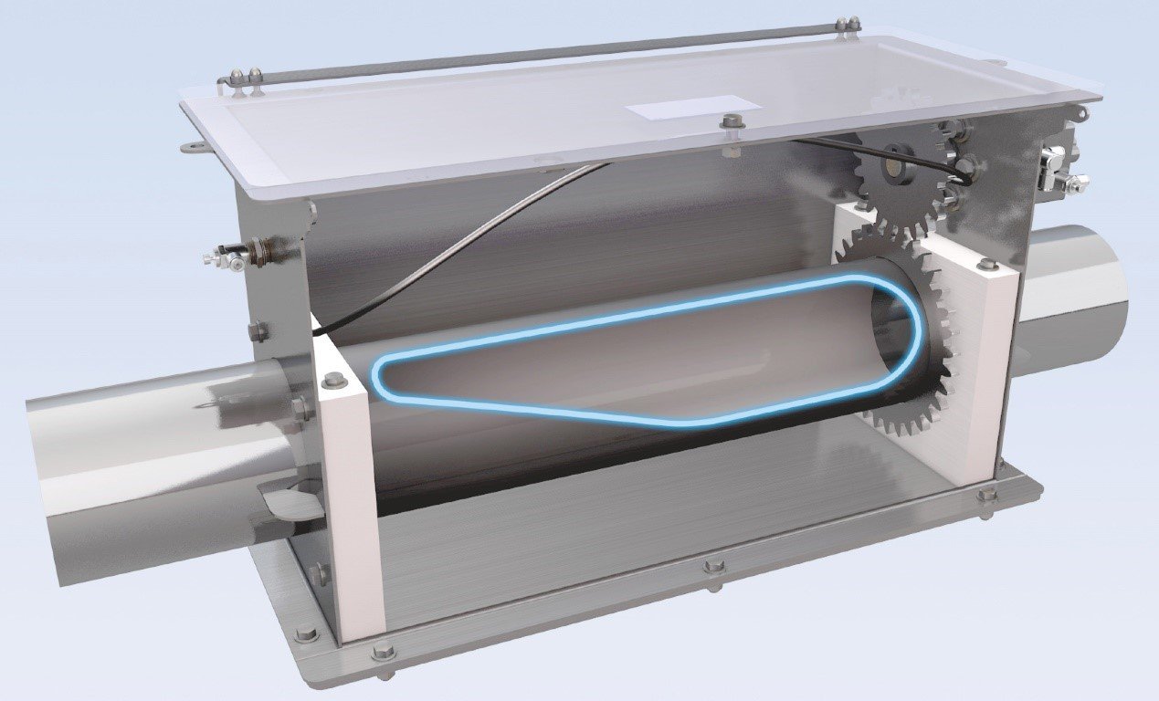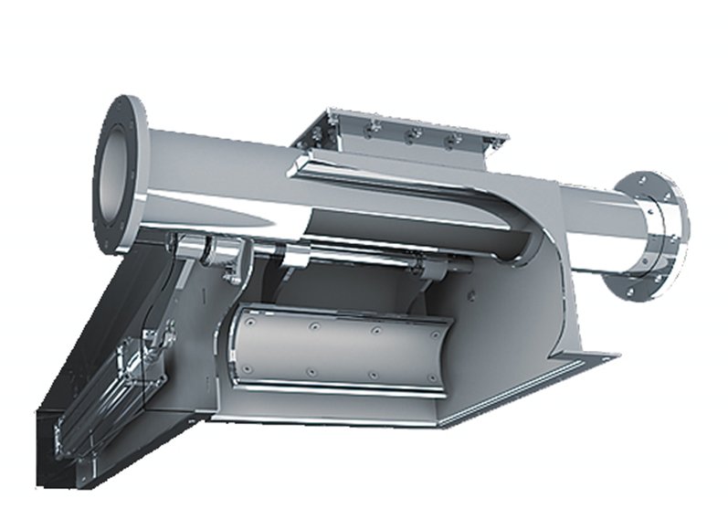 2、 氣動開合卸料閥,應用在對物料破損率低和卸料無殘留的工況,特別是食藥行業應用較多,可以實現卸料徹底無殘留,見圖14所示。它的工作原理是通過氣缸執行臂擺動,對輸送管道下面“剖口面”實現“開口卸料”和“閉合關閉”的功能,它的優點是卸料反饋快速徹底,缺點是不能實現部分卸料,只能完全卸料。