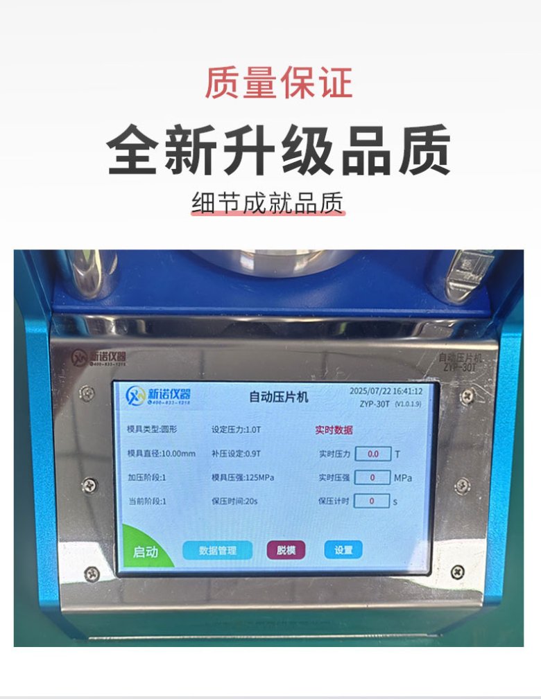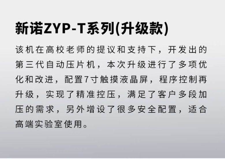 該機在高校老師的提議和支持下,開發出的第三代自動壓片機,本次升級進行了多項優化和改進,配置7寸觸摸液晶屏,程序控制再升級,實現了精準控壓,滿足了客戶多段加壓的需求,另外增設了很多安全配置,適合高端實驗室使用。