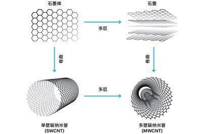 碳納米管分為兩類-單壁碳納米管(SWCNTs)和多壁碳納米管(MWCNTs)。單壁碳納米管為單層石墨烯片卷起來形成的無縫空心圓柱筒,而多壁碳納米管為單壁碳納米管的同心排列,即由多層石墨烯片無縫卷起成管狀。