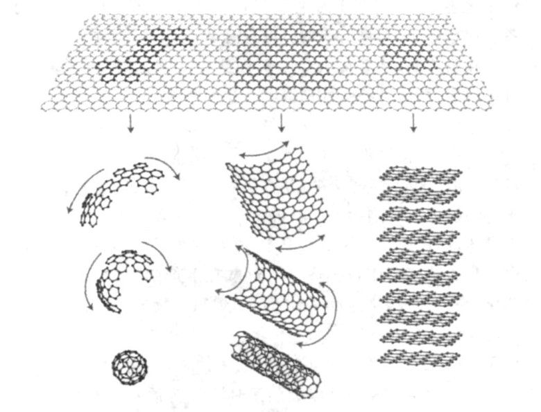 石墨烯構成富勒烯、碳納米管和石墨示意圖