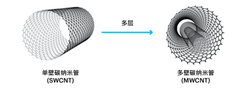 單壁碳納米管(Single-Walled Carbon Nanotubes, SWCNT)由一層石墨烯片組成,單壁管典型的直徑和長度分別為0.75-3nm和1-50um。多壁碳納米管(MWCNT)含有多層石墨烯片,形狀像個同軸電纜,其層數從2-50不等,層間距為0.34nm左右,與石墨層間距相當。多壁管的典型直徑和長度分別為2-30nm和0.1-50um。