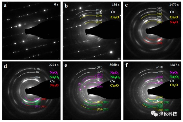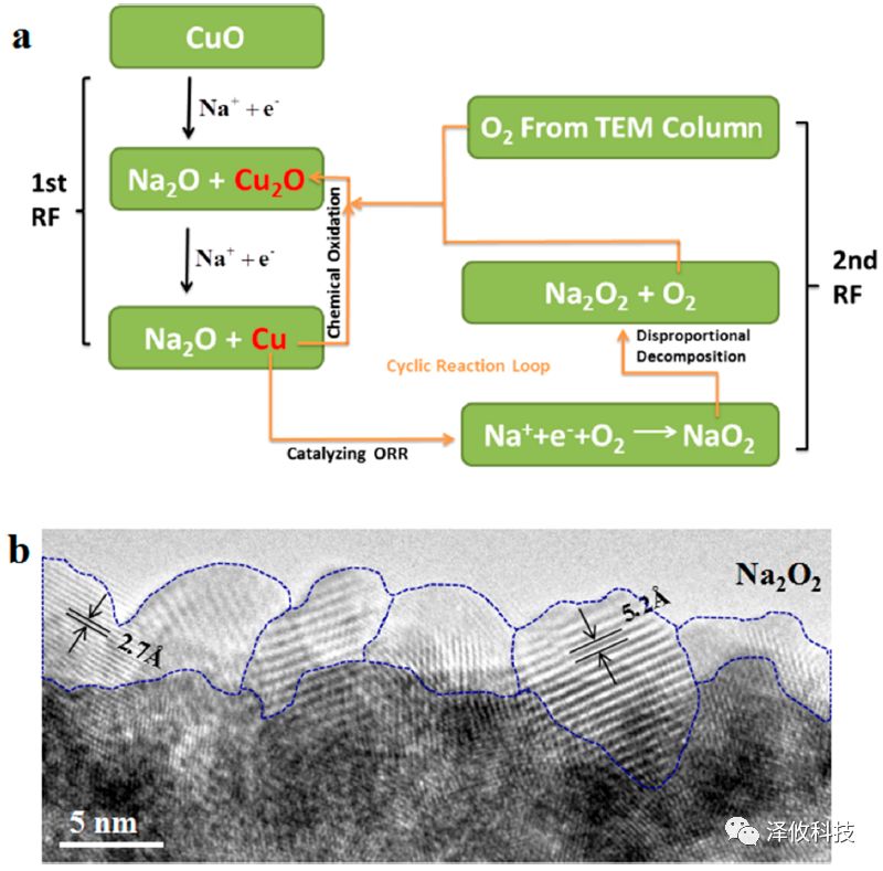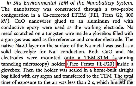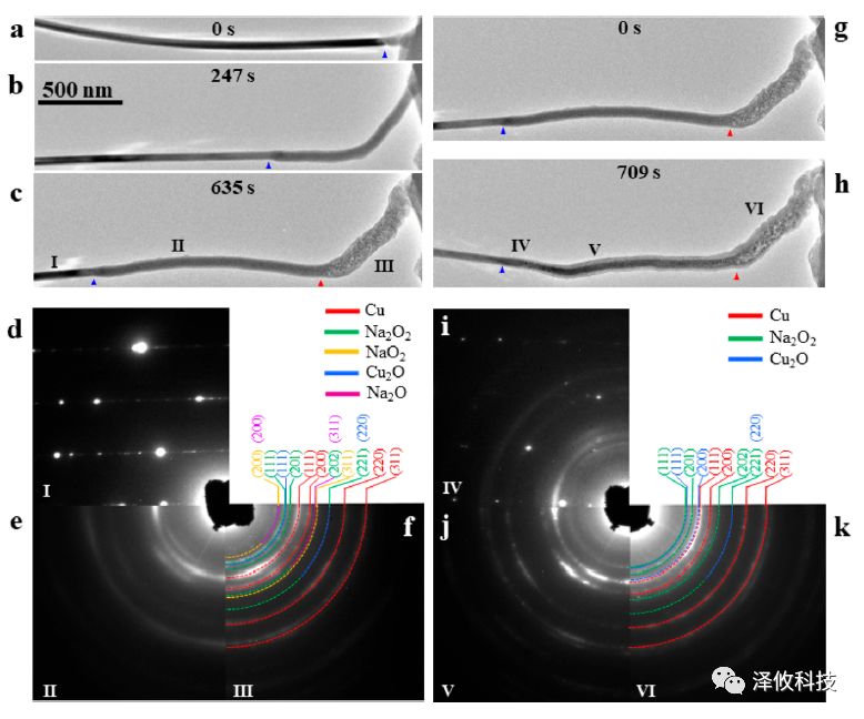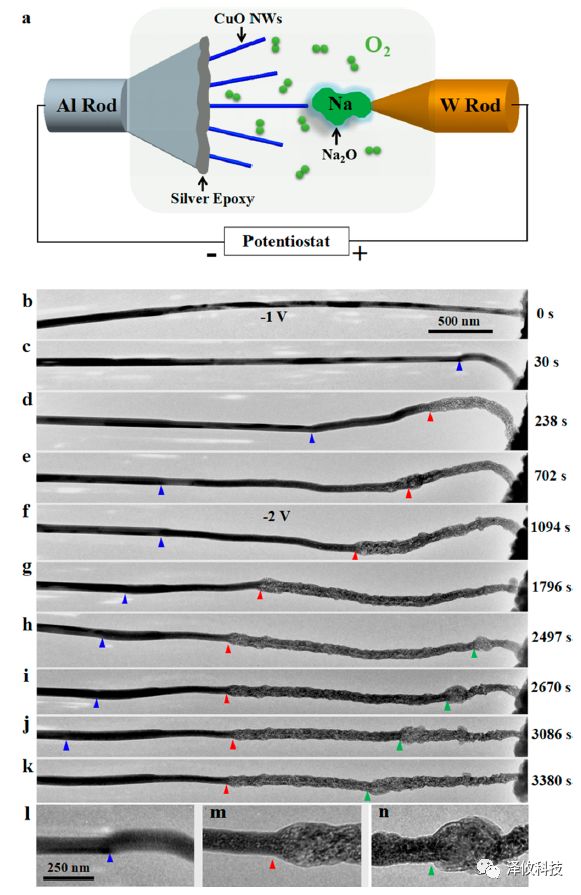 5月9日的《Nano Letter》期刊再次報道了澤攸科技的原位測量系統(tǒng)在固態(tài)氧鈉電池研究中的應用(DOI: 10.1021/acs.nanolett.8b00894)。在這一研究中,CuO納米線/O2作為電池的空氣陰極,Na作為電池的陽極。結(jié)合球差校正環(huán)境透射電鏡,研究者們原位觀測到了在通電之后固態(tài)氧鈉電池中發(fā)生的化學反應。整個化學反應過程分為兩個階段:(1)CuO轉(zhuǎn)化為CuO2,緊接著又轉(zhuǎn)化為Cu;(2)NaO2形成,并緊接著又轉(zhuǎn)化為Na2O2和O2。CuO納米線在這一過程中發(fā)生明顯的膨脹。值得一提的是,整個化學反應過程沒有生成碳酸鹽。這一研究成果對于理解應用無碳空氣陰極的固態(tài)鈉氧電池非常重要。