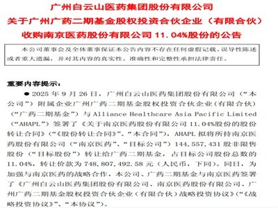 - ·出資7.5億!廣藥白云山“空降”南京醫藥二股東